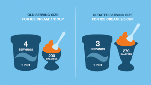 The new serving size is represented by Baskin Robbins serving size of 2/3 cup. 270 calories cups.