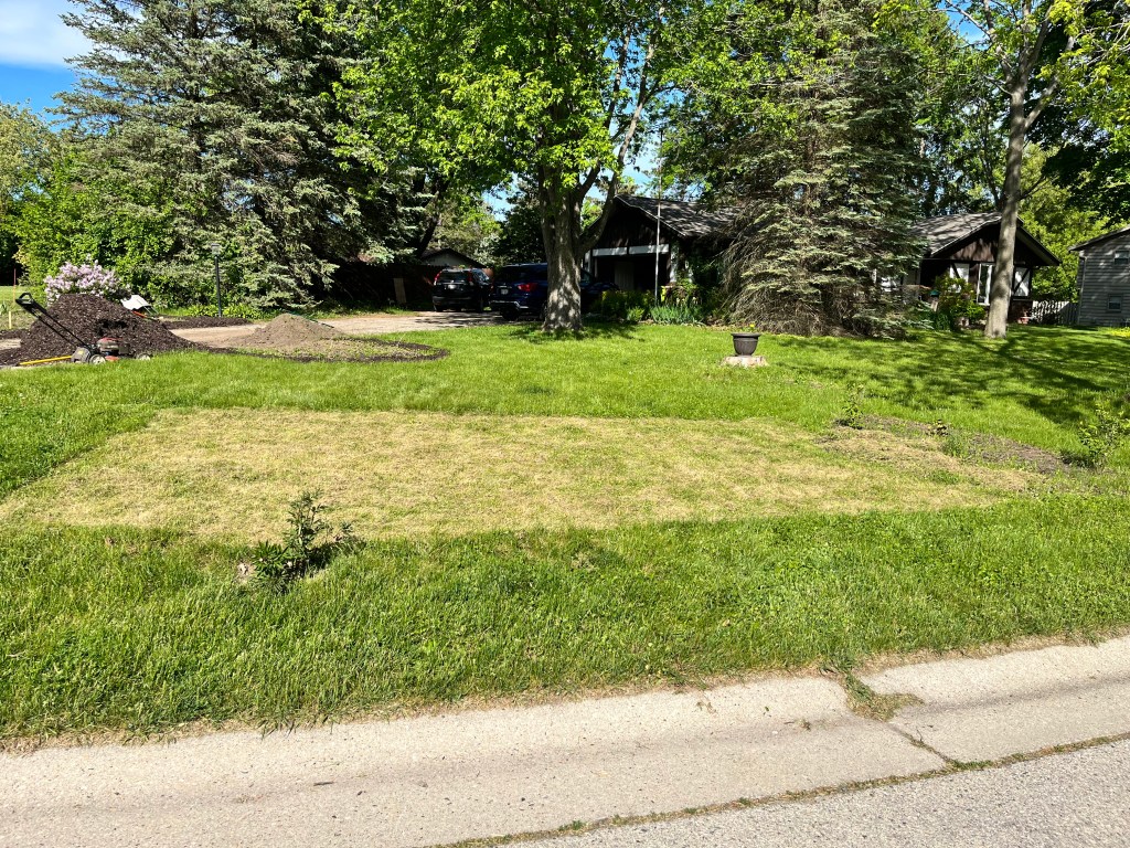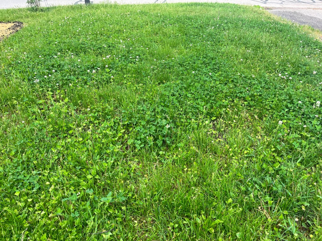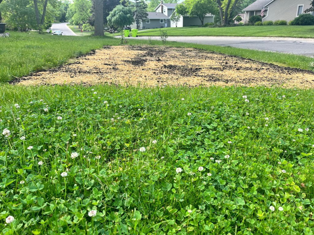 So, I seeded the area with a bee-lawn mix. Twin City Bee Lawn seed mixture. I then applied a thin layer of hay to help retain moisture as the seedling sprouted. Then you do have to water it once or twice a day depending on precipitation and temperatures. Above is a picture of it in late May. You can see the white clover is blooming.