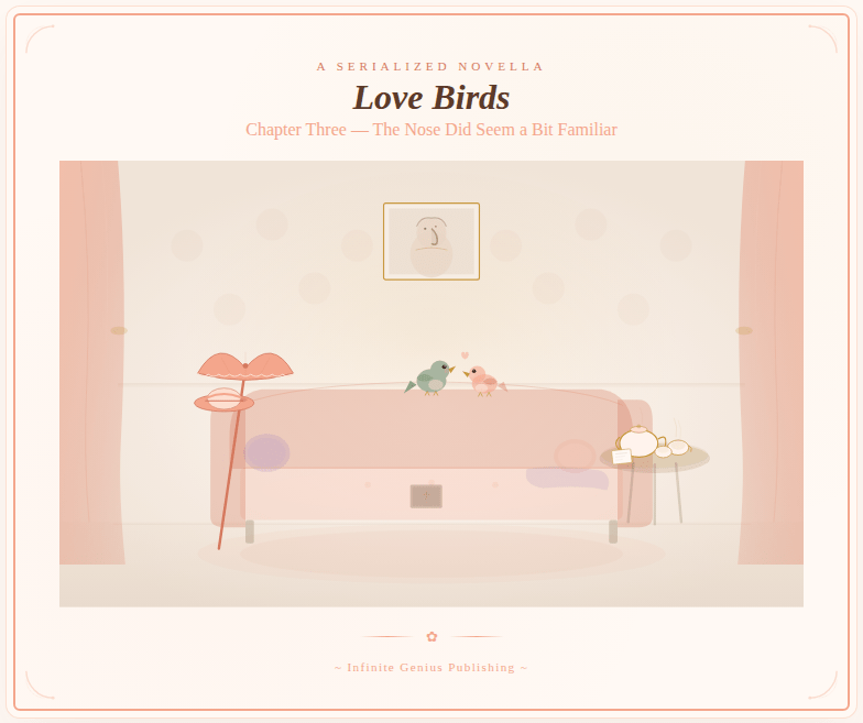 Mrs. Macchiato adjusted the frills of her peach-colored dress, precisely matched to the parasol and wide-brimmed hat she carried. If she were about to entrust her daughter’s romantic future to a man and his bird, at least she would do so impeccably dressed.